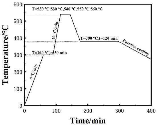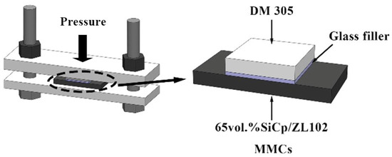 Before the sealing test, the base metal was pretreated. The DM305 glass was ultrasonically cleaned with an alcohol acetone solution and dried. For the pre-treatment of the 65 vol.% SiCp/ZL102 composites, the specific process flow is as follows. First, the surfaces of the composites were polished with 600 # SiC sandpaper and ultrasonically cleaned with an alcohol solution. Then, they were washed with NaOH and HCl solutions, respectively, and ultrasonically cleaned with an alcohol solution. Finally, the composites were put into a resistance furnace for pre-oxidation treatment, and the temperature was raised from room temperature to 520 °C after 52 min and kept for 2 h. As shown in Figure 2, the prepared paste glass filler was evenly applied to the surface of the sample to form a sandwich structure. The pressure applied on the structure during the brazing process was approximately 0.02 MPa. The samples were connected in a resistance furnace. According to the thermodynamic properties of the glass filler and the characteristics of 65 vol.% SiCp/ZL102 composites, the sealing experiment was completed with the process curve shown in Figure 3.