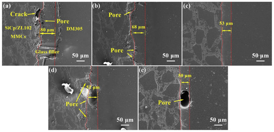 As shown in Figure 4a, the width of the brazing seam was about 80 μm when the sealing temperature was 520 °C. There were cracks and a large number of pores on the interface side of the composite in the brazing seam. The glass filler failed to form a good bond with the composites, but it was well bonded to the DM305 glass. As shown in Figure 4b, the width of the brazing seam was about 68 μm when the sealing temperature was 530 °C. Additionally, there were no cracks in the joint, but there were dense clusters of pores on the composite side. There were many capillary pores in the oxide film on the surface of the aluminum matrix composites. When the sealing temperature was high, the solubility of hydrogen in aluminum was large. However, when the brazing joints were cooled, the hydrogen decomposed by the water-containing oxide film did not overflow in the joints, and the hydrogen holes were formed near the composite side. Under a certain air humidity, Al2O3·H2O and Al2O3·3H2O can be formed as follows [24]: