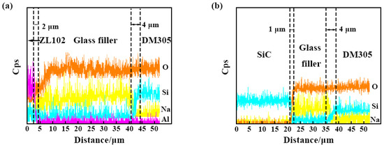 As shown in Figure 6a, there was an element diffusion layer with a width of about 2 μm at the interface of ZL102–glass filler. From ZL102 to the glass filler, the content of Al decreased, and the content of O increased. The reason for this phenomenon was that there was an Al2O3 film on the surface of ZL102. Additionally, the Al2O3 reacted with the glass filler by element diffusion and constantly dissolved into the glass filler. In addition, in the [SiO4] of the borosilicate glass, the minimum Si-O spacing was 1.4 Å, with a maximum of 2.6 Å, and the atomic radius of Al is 1.82 Å. Therefore, Al atoms can diffuse into the glass and distort the Si-O tetrahedron. Al atoms diffused into the glass to form a new glass phase separation, thereby promoting bonding. As shown in Figure 6b, there was a certain concentration of Si and O diffusion at the interface of the SiC–glass filler. It was considered that there was a very thin SiO2 film on the surface of the SiC particles. During the sealing process of heating and pressing, SiO2 dissolved slowly into the glass filler, and a chemical reaction occurred, thus playing a connecting role.
