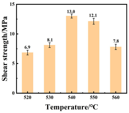 In order to find the best sealing temperature, the effect of the sealing temperature on the mechanical properties of the joint was studied. Three samples were tested for each sealing temperature. Figure 7 shows the shear strength of the joint at different sealing temperatures. It can be seen that the shear strength of the joint increased first and then decreased with the increase in the sealing temperature. When the sealing temperature was 520 °C, the shear strength of the joint was only 6.9 MPa, and the maximum shear strength of the joint was 13.0 MPa at 540 °C. However, the sealing temperature further increased to 550 °C and 560 °C, and the shear strength decreased to 12.1 MPa and 7.8 MPa, respectively. At low temperatures, the viscosity of glass filler was high, and the diffusion reaction between the glass filler and the base metal was weak. Additionally, cracking appeared after welding; therefore, the joint strength was low. With the increase in temperature, the element diffusion in the joint was excessive and some elements in the glass filler volatilized. These factors lead to the presence of large-diameter bubbles in the weld and the loose silicon–oxygen structure on the DM305 side, which had a significant negative impact on the shear strength.