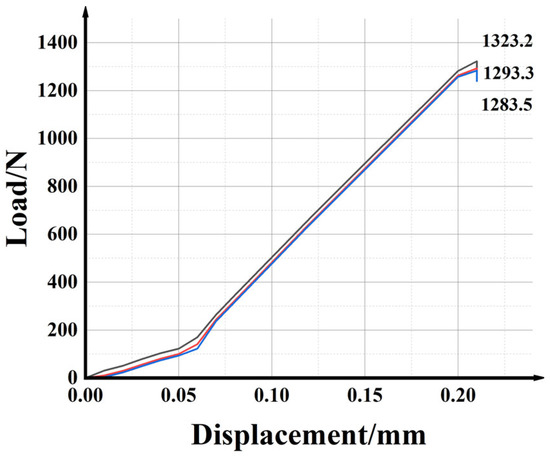 Figure 8 shows the strain–stress curves for the samples during the shear test. Three curves of different colors are the results of three repeated shear tests. And the strain–stress curves increased sharply, reached their maximum peak, then decreased sharply. In the curve, no platform stage was observed, indicating the brittle fracture nature of the composite joint samples. The room temperature shear strength of the three brazed samples were 1323, 1293, and 1284 N, giving an average value of 1300 N at room temperature. Additionally, according to Equation (5), the shear strength was 13 MPa. The impact of the shear strength on the electronic packaging materials is less than that of air tightness, and the shear strength is generally between 3 and 15 MPa [17].