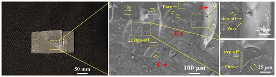Figure 9 shows the shear fracture morphology of the sealed joint at 540 °C for 30 min. From a macro point of view, the DM305 glass broke in the middle, and half of the DM305 glass fell off. In addition, there was almost no glass filler on the surface of the composite on the falling side. According to the EDS element analysis in Table 4, point A is the DM305 glass, and point B is the glass filler, while point C is the SiC particles. It can be seen from Figure 9 that there were isolated pores on the fracture surface, and the fracture showed a step-like fracture morphology, a typical brittle fracture feature. From the local fracture magnification map, it can be seen that there were incomplete pores with a semi-circular arc at the root of the fracture step. This means that the fracture may occur at the pores in the weld and extend to the base metal on both sides.