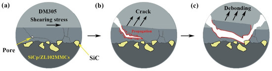 The fracture micro-evolution process diagram of the joint is shown in Figure 10. The process of joint fracture was mainly divided into three stages: (a) the initiation of microcracks, (b) the propagation of cracks, and (c) the fracture of joints. During the heating and cooling process of the sealing test, there was residual stress in the sealing joint due to the different coefficients of thermal expansion between the three base metals. Under the action of shear stress parallel to the weld, the glass filler was subjected to tensile stress in the opposite direction of the base metal on both sides, resulting in micro cracks. As the shear stress further increased, the microcracks gradually expanded to the pores in the glass filler, causing the pores to rupture. The area of crack propagation gradually increased, and the crack extended to the sharp SiC particles exposed on the surface of the 65 vol% SiCp/ZL102 composites. Due to the stress-concentration effect, the joint ultimately suffered a fracture.