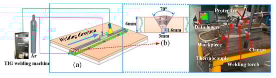 (a) TIG welding experimental set-up and (b) schematic of welding sequence and groove shape.