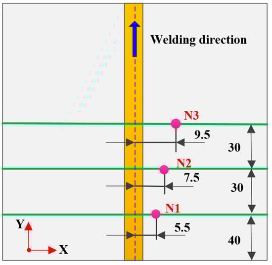 Figure 9a shows the measured and simulated thermal cycles for the first welding pass in the welded joint. By comparing the values of the heating rate, peak temperature, and cooling rate at three observation points (N1, N2, and N3), respectively, it can be concluded that the simulated results matched the trend of the measured thermal cycles generally. Additionally, there was also a small error between the temperature peaks obtained from the simulation and the experiment, which may be attributed to the heat source model and the measurement method. Overall, it can be shown that the model established in this research was correct and effective and can be used for the subsequent mechanical simulation analysis of residual stress.