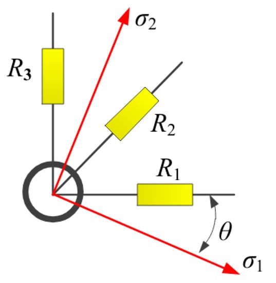where ε1, ε2, and ε3 represent the released strains measured by strain gauges R1, R2, and R3, respectively; θ is the angle between σ1 and R1; and A and B denote strain release factors, which could be calibrated by experimental tests or simulations.