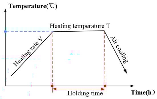 After the weldments were cooled to room temperature, the local PWHT was performed on the weld and its vicinity to reduce the residual stress. In order to study the influence of local PWHT on the residual stress in detail, the process parameters of local PWHT were further analyzed, and the holding time and holding temperature were the critical factors affecting the residual stress. Therefore, in this work, several different cases were analyzed by numerical simulation. When studying the effect of holding time on residual stress relaxation, the holding temperature was kept at 700 °C, and the holding time varied from 1 h to 5 h. When studying the influence of holding temperature on residual stress relaxation, the holding time was kept at 3 h, and the holding temperature varied from 500 °C to 800 °C. It was worth noting that the holding temperature of all cases should definitely be less than the phase transition start temperature of the β phase, the heating rate v was 45 °C/min, and the cooling method was air cooling. The curve of local PWHT is shown in Figure 7.