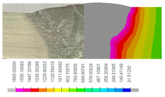 In thermal simulation analysis, since the melting point for TC4 titanium alloy is 1665 °C, the isotherm with a temperature of 1665 °C can be used as the boundary line of the solid-liquid interface, and the region of temperature above 1665 °C in the temperature field can be regarded as the molten pool. Figure 8 clearly represents the weld transverse cross-section morphology obtained from experimental and simulated results.