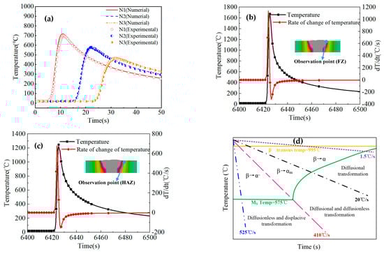 In Figure 9b, it can be seen that the peak temperature of the target point in FZ near the fusion line had reached the melting point of the material for the last welding pass, and its maximum cooling rate was about 327 °C/s in the range of 20 °C/s and 410 °C/s during the cooling process, which would lead to the diffusional and diffusionless transformations according to Figure 9d [8,31]. On the other hand, according to Figure 9c, the peak temperature of the target point in HAZ can reach 1222 °C, which is greater than the β phase transus temperature but less than the melting point of the material, and its maximum cooling rate during cooling was 154 °C/s and was smaller than that in FZ, which may make the transus temperature, morphology, and content of α、 phase different from those in FZ.