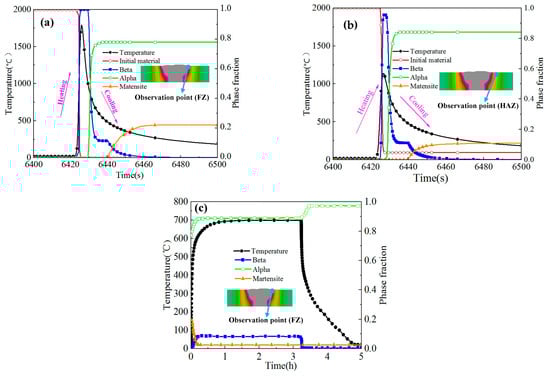 The changes of various phases in the FZ and HAZ of weldments during heating and cooling were quantitatively studied through simulation analysis. At the same time, the change of phase in the FZ during local PWHT was also discussed, and that in the HAZ during local PWHT will not be discussed further here due to its small change. Figure 10a,b shows the simulated variations in the volume fractions of α, β, and α、 phases at observation points in the FZ and HAZ of weldment during welding, respectively, and Figure 10c shows the simulated variations in the volume fractions of α, β, and α、 phases at an observation point in the FZ near the fusion line of weldment during local PWHT at 700 °C for 3 h.