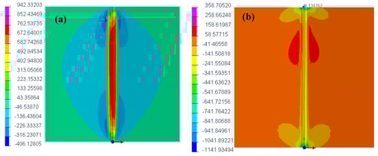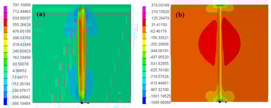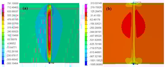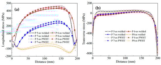 A numerical simulation of the local PWHT with a holding temperature of 700 °C was carried out. The distribution contour plot of the residual stress in the weldments after local PWHT was obtained, as shown in Figure 14a,b. By comparing Figure 13 and Figure 14, it can be clearly seen the peak values of longitudinal and transverse residual stress became significantly smaller after local PWHT, and the distribution of residual stress also changed, indicating the feasibility of the local PWHT to improve the residual stress state in the weldments.