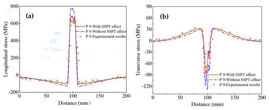 Distribution of (a) longitudinal and (b) transverse residual stress along path P9 after welding with and without SSPT.