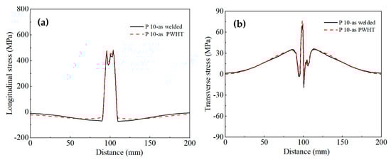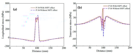 Distribution of (a) longitudinal and (b) transverse residual stress along path P10 after welding with and without SSPT.