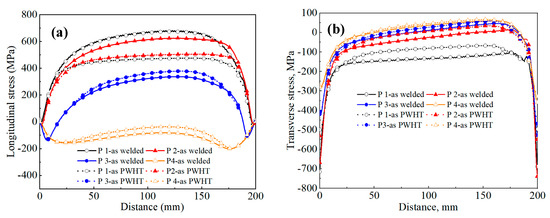 In order to quantitatively analyze the change of residual stress on the top side of weldments after welding and local PWHT, the residual stresses on the paths P1, P2, P3, P4, and P9 in Figure 13 and Figure 14 were extracted, respectively, as shown in Figure 17 and Figure 18. It could be seen from Figure 17a that the weld and its vicinity on the top side of the weldments presented the longitudinal residual stress as the distance from the weld increased, the residual stresses first became compressive and then became 0 MPa at the edge of the base metal. The peak values of longitudinal residual tensile stress on the observation path P1, path P2, and path P3 were 681.8 MPa, 625.4 MPa, and 337.3 MPa, respectively, while the peak value of longitudinal residual compressive stress on the path P4 was −200 MPa. The reason for the presence of residual stress in the weldments after welding is that the metal material in the molten pool would shrink during cooling and would be restrained by the surrounding metal, resulting in tensile stress in the weld. The resulting tensile stress that does not exceed the yield strength of the material would remain in the weldments, resulting in a larger tensile residual stress in the weld when cooling to room temperature. At the same time, due to the self-balance of the internal stress in the weldments, the longitudinal residual compressive stress will be generated on both sides of the weld, and as the distance from the weld increases, this compressive effect gradually decreases until the longitudinal residual stress on the edge of the base metal approximately becomes 0 MPa.