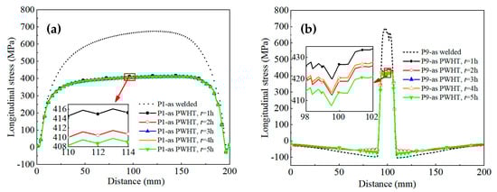 Through the analysis in the previous sections, it could be found that local PWHT can effectively reduce the residual stress, especially the longitudinal residual stress in the weld. Thus, the influence of local PWHT parameters on the residual stress ought to be further studied, and the holding time and holding temperature were the important factors that were analyzed. Through the numerical analysis of different cases, the longitudinal residual stresses on the path P1 and the path P9 on the top side of the weldments were obtained under the conditions of different holding times and different holding temperatures, respectively, as shown in Figure 21 and Figure 22.