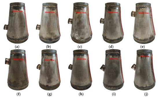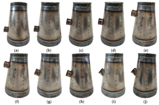 The test models were fabricated according to the above dimensions. Firstly, the 304 stainless steel plate with a nominal thickness of 1 mm was cut and rolled. The two ends of the rolled sample were welded by tungsten inert gas butt welding, and then the hole was opened at the set position. Then, use a 304 stainless steel plate with a nominal thickness of 1.2 mm to roll the welded cylinder as a reinforcing wall. Finally, the large and small ends of the conical shell model and one end of the cylindrical wall were welded to seal. The thickness of the head ( = 15 mm) was set to 15 times the thickness of the conical shell. The conical shell models were polished after welding. Ten test models are shown in Figure 2.