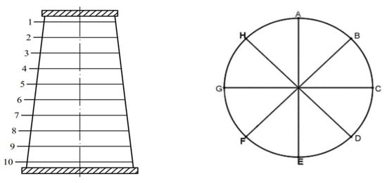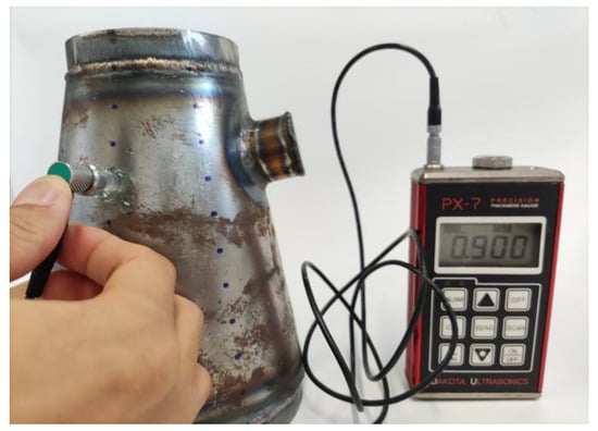 Firstly, the geometric measurement of the conical shell was carried out, and the measured thickness data provided the parameters for the subsequent finite element simulation. Each conical shell with an opening had 80 measuring points. Eight points were distributed 45° apart along the circumference, and ten points were distributed uniformly along the axis, totaling 80 measurement points, as shown in Figure 3. As shown in Figure 4, the equipment used was an ultrasonic thickness gauge. The working principle was to use the pulse reflection of an ultrasonic wave in the medium to test the thickness of the object, and the measurement accuracy was ±0.001 mm. The thickness gauge probe was coated with an ultrasonic coupling agent before measurement. When the thickness gauge signal reaches full scale or only one full-scale difference, the reading and recording are performed. The measurement results are shown in Table 2, where was the nominal wall thickness, was the maximum wall thickness, was the minimum wall thickness, was the average wall thickness, and was the thickness standard deviation. Figure 5 shows the measurement thickness diagram of CS-/2-0-1.
