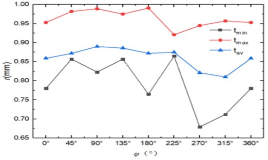 The minimum, maximum, average, and standard deviation data of the wall thickness of the ten conical shell samples are listed in Table 2. The errors of the minimum thickness and the maximum thickness of the ten conical shell models are in the range of 0.148 to 0.340 mm. The average thickness varies in the range from 0.690 to 0.920 mm, and the thickness standard deviation varies in the range from 0.029 to 0.052 mm. These errors may have been caused by the model during the production process. These errors do not affect the rationality of the analysis results, and the analysis results still have reference values.