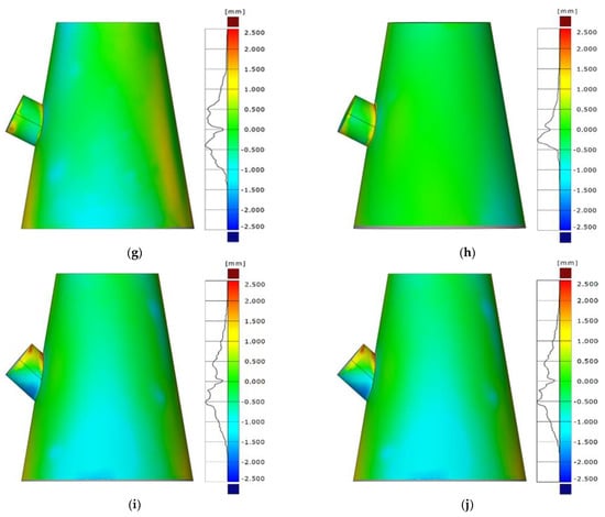 Fabrication deviations of the test models from perfect geometries. (a) CS-1/4-0-1, (b) CS-1/4-0-2, (c) CS-2/4-0-1, (d) CS-2/4-0-2, (e) CS-3/4-0-1, (f) CS-3/4-0-2, (g) CS-2/4-15-1, (h) CS-2/4-15-2, (i) CS-2/4-30-1, (j) CS-2/4-30-2.