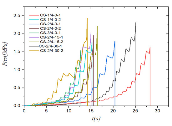 After the measurement and scanning, the hydraulic test was carried out on each specimen. After the test, the water pressure curve of each model was obtained. Considering the buckling load obtained by simulation is small, a pressure chamber with a range of 8 MPa was selected. The preparation steps and procedures for the hydrostatic test were described in detail in previous reports [13,14,15]. The damaged conical shell was shown in Figure 8, in which the CS-3/4-0-2 model fails to leak water and the other models are normal without leakage. Table 3 was the hydrostatic test data table for ten conical shells, and the recorded pressure curve was shown in Figure 9.