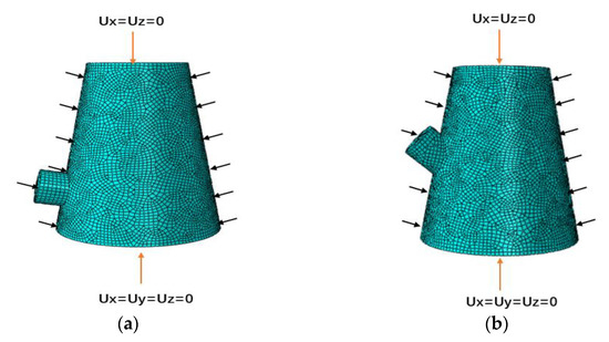 The conical shell model was first built on ABAQUS. The point cloud model scanned in Section 3.1 is imported into ABAQUS to be uniformly thickened. The thickness is the average thickness of the actual measurement of each model. Each model has the same material properties: Young’s modulus E = 200 GPa, Poisson’s ratio μ = 0.291, yield strength = 628 MPa, mass density = 7930 . Then the model is divided into grids, which are all composed of S4 and S3 grid types. The grid size is determined by the grid density convergence analysis method, and the mesh length cannot exceed 0.5 [18]. The same boundary condition setting and loading method are used for each conical shell structure model [19]. One end of the conical shell is fully constrained, and the other end retains axial movement. The outer surface is subjected to = 1 MPa uniform external pressure load. The boundary conditions and loading are shown in Figure 10.
