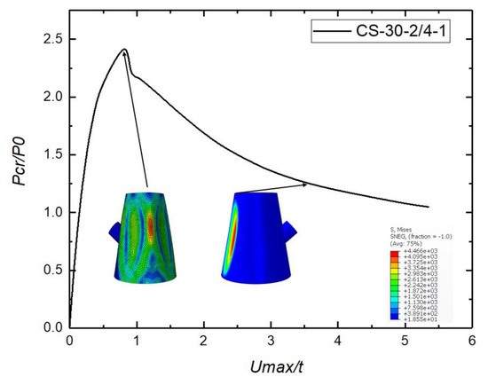 Equilibrium path, critical buckling mode, and post-buckling mode for CS-2/4-30-1: Pcr/P0 is the ratio of the applied external load to the initial load (P0 = 1 MPa), and Umax/t is the ratio of the maximum deformation Umax to the nominal shell thickness t.