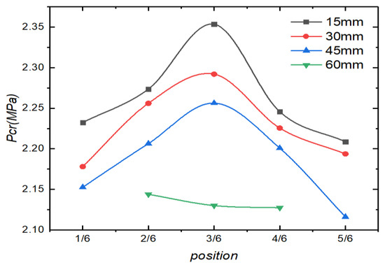 Figure 12 shows that when the opening position is the same, the bearing capacity of the conical shell decreases with the increase in the opening diameter. When the opening rate is less than 0.540, the closer the opening position is to the middle, the greater the critical buckling load is, and the load is the largest when the opening is in the middle position. When the opening ratio reaches 0.540, the opening position has little effect on the bearing capacity of a conical shell.