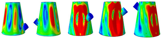 From Figure 13, it can be seen that the larger stress areas of the five modes are distributed in a block shape. When the opening positions are 3/6 or 4/6, the collapse area mainly surrounds the area near the reinforced enclosure wall. When the opening positions are 1/6, 2/6, and 5/6, the collapse area is all near the opposite side of the reinforced enclosure wall. The position of the opening has a certain impact on the buckling mechanical characteristics of the conical shell strengthened by the opening.