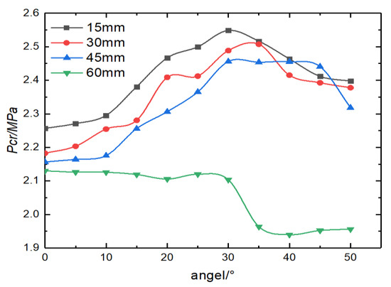 This section mainly discusses the effect of the inclination angle and opening size on the stability of a conical shell. The opening position is set at 1/2 of the generatrix of the conical shell, the inclination angle of the reinforced wall is selected in the range from 0 to 50°, with an interval of 5°, and the opening sizes are 15, 30, 45, and 60 mm, respectively. A total of 44 models are established to discuss the effect of the inclination angle of the wall and the opening size on the critical load of the conical shell. The analysis results are shown in Table 6. The curves of the critical buckling load values of the four apertures at different wall inclination angles are shown in Figure 14.