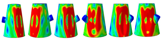 Taking the aperture of 30 mm as an example, the following is a set of buckling mode diagrams of reinforced conical shells with holes around the angle of the reinforced wall. They are 0°, 10°, 20°, 30°, 40°, and 50° from left to right, as shown in the following Figure 15.