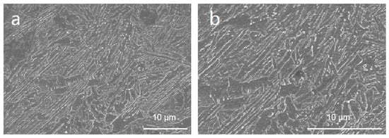 As shown in Figure 1, specimens 1# and 2# exhibit a typical slatted bainite microstructure where the original austenite grain boundaries are faintly visible. Another important feature of the slatted bainite organization is the presence of fine M/A islands (martensite + austenite residual) particles that are arranged in an orderly manner. The direction of the M/A island arrangement is roughly parallel to the slats and tends to be straight. It is widely acknowledged that the slat bainite organization is more uniform and corrosion-resistant than the traditional ferrite + pearlite organization in weathering steel [33,34,35].
