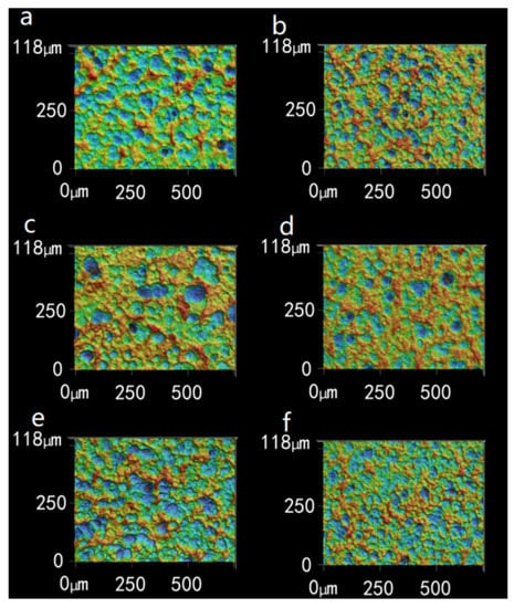 After conducting the dry/wet cyclic corrosion test and removing the rust from the specimens, the corrosion morphology of the steel substrate surface was examined using a laser confocal microscope. The results presented in Figure 2a,b indicated that after 120 h of testing, the surface of the samples exhibited localized corrosion morphology. The 1# steel sample showed some relatively open corrosion pitting resulting from the fusion of some corrosion pitting, whereas the corrosion pitting of the 2# sample was smaller in both vertical and horizontal dimensions, and the formed corrosion pitting was relatively isolated.