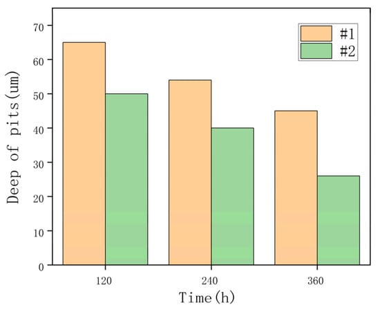 The results of statistical mapping of the depth of corrosion pitting on the surface of 1# steel and 2# steel samples are shown in Figure 3. It can be seen from the statistical results that with the increase of time, the depth of corrosion pitting on the surface of 1# and 2# steel has decreased, but the depth of corrosion pits on the surface of 2# steel is smaller than that of 1# steel. Further deepening makes the corrosion uniformity of 2# steel better.
