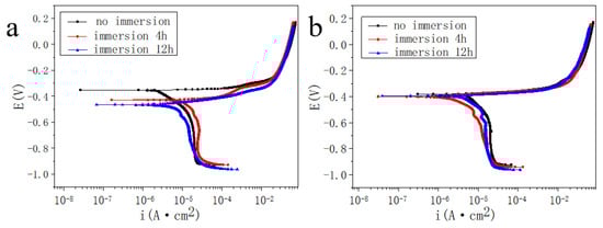To investigate the electrochemical behavior of E690 alloy fine-tuned steel at the early stage of corrosion, the polarization curves of 1# and 2# specimens were compared. The specimens were not immersed, immersed for 4 h, and immersed for 12 h in the simulation solution, as shown in Figure 4. It has been reported that at the early stage of corrosion, the polarization curves of the two sheets of steel in the simulation solution exhibited little difference, and both cathodic and anodic processes were controlled by activation. However, the potential of the polarization curve of 1# steel decreased significantly with the extension of the immersion time, whereas the change of the electric polarization curve of 2# with the extension of the immersion time was not significant [28].