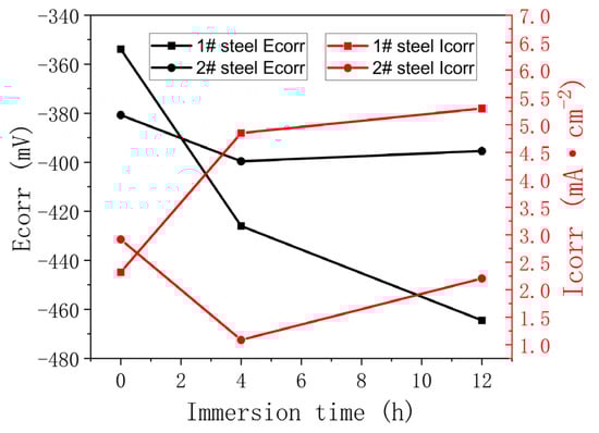 The Ecorr (corrosion potential) and Icorr (corrosion current density) of two sheets of steel were obtained after fitting the polarization curve data, and the results are shown in Figure 5. The corrosion potential of 1# steel was slightly higher than that of 2# steel before immersion. However, after immersion for 4 h, the corrosion potential of 2# steel was about 25 mV higher than that of 1# steel, and after 12 h of immersion, it was significantly higher by about 70 mV. The corrosion current density of 2# steel was higher than that of 1# sample without immersion. As the immersion time prolonged, the corrosion current density of 1# continued to rise, although the upward trend gradually slowed down. The corrosion current density of 2# steel first decreased significantly and then increased, but it was generally lower than the corrosion current density when it was without immersion. When the immersion time was longer than 4 h, the corrosion current density of 2# steel was always lower than that of 1# steel. These results suggest that the corrosion activity of 2# steel was slightly higher than that of 1# steel at the initial stage of corrosion, and the corrosion activity was significantly lower than that of 1# steel as the immersion time prolonged. The rust layer on the surface of 2# steel was found to be more protective than that of 1# steel, which increased the resistance of oxygen diffusion and resulted in a decrease in corrosion current density and a slowdown trend of corrosion potential.