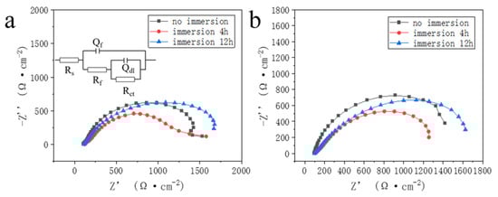 Figure 6 shows the electrochemical impedance spectrum and equivalent circuit diagram of the 1# and 2# samples in the Xisha simulated solution. In the diagram, Rs represents the solution resistance, Qf and Rf represent the constant-phase element of the rust layer and its resistance, respectively, while Qdl and Rct represent the double-layer capacitance and charge transfer resistance, respectively. The AC impedance data of the two sheets of steel after different immersion times were analyzed and fitted, and the results are presented in Table 2.