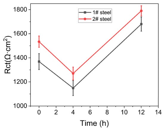 Figure 7 shows a comparison diagram of the charge transfer resistance of 1# and 2# sheets of steel in Xisha marine atmosphere simulated solution. It was observed that the charge transfer resistance of both steel samples decreased with an increase in immersion time up to 4 h, and then significantly increased after 12 h. This behavior can be attributed to the fact that as a corrosion reaction occurs, the charge transfer resistance of the corrosion area on the sample surface decreases. Moreover, the charge transfer resistance of 2# steel was found to be higher than that of 1# steel, indicating that alloy adjustment can improve the charge transfer resistance of E690 steel.