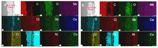 After conducting a 120-h cycle immersion test on the 1# and 2# E690 steel samples, the thickness of the rust layer was measured. The average thickness of the rust layer on 1# steel was 210 (±7.5) μm, and that on 2# steel was 200 (±4.2) μm, indicating little difference between the two (Figure 9). The EDS analysis of the rust layer element distribution map revealed that both samples had an obvious enrichment of the S element in the inner rust layer near the steel substrate, while the enrichment of the Cl element was not significant. The Cr element was found to be significantly enriched in the inner rust layer of both sheets of steel, with a larger and deeper enrichment area and degree in 2# steel. Research has shown that the enrichment of Cr in the inner rust layer can promote the formation of a protective α-FeOOH layer and allow Cr atoms to replace the position of Fe in α-FeOOH in the inner rust layer form α-(Fe1-x, Cr-x) OOH, in which fine grains can promote the formation of a dense rust layer [36].