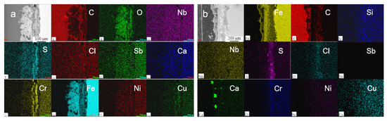 Cross-sectional morphology and element distribution of the rust layer formed on the experimental steels after 120 h dry/wet cyclic corrosion test: (a) 1# steel, (b) 2# steel.