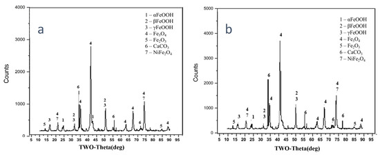 The X-ray diffraction (XRD) patterns of the two sheets of steel are shown in Figure 11. Both patterns indicate that Fe3O4, α-FeOOH, γ-FeOOH, β-FeOOH, and Fe2O3 (Hematite) are the main constituents of the rust layer. Among these, Fe3O4 is the dominant component, and its dense layer enhances the material’s corrosion resistance [37]. γ-FeOOH and β-FeOOH are considered early corrosion products under alternating dry and wet conditions, and they can promote corrosion initiation and development [38]. On the other hand, α-FeOOH is a stable corrosion product formed later, with good continuity and compactness, and is non-conductive, which can protect the steel matrix effectively [39]. The ratio of α-FeOOH to γ-FeOOH content can be used to assess the protective performance of the rust layer on the steel surface [40]. The semi-quantitative analysis showed that the ratios of α-FeOOH and γ-FeOOH in the rust layer of 1# and 2# steel were 0.24 and 0.36, respectively, indicating that the protective performance of the rust layer was significantly improved after alloying.