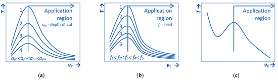 Cutting speed affects machining productivity in a linear relationship, but tool life, expressed by cutting ability, is degraded exponentially. The relationship between these two physical regularities of the cutting tool is determined by the kinematics of the machine tool and the events (both physical and chemical) in contact between the tool and the machined material. The general effect of cutting speed vc on durability T is documented in Figure 1c. This dependence shows the region appropriate for the good relationship of cutting speed and durability of the tool [1,7,8].