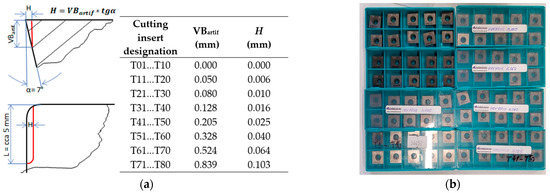 At every new test, a cutting tip with a new cutting wedge was used, so one cutting insert was active for four experiments (with different corners). The geometry of created artificial wear VBartif, as well as the values of the VBartif (mm) and grinding depth H (mm) for the individual cutting inserts, are shown in Figure 6a, while prepared cutting inserts are shown in Figure 6b.