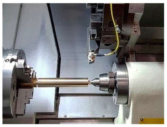 The universal CNC turning machine DMG MORI ecoTurn 450 was used for experiments. A three-jaw chuck and a rotational tailstock were used for the workpiece clamping and supporting as shown in Figure 7.
