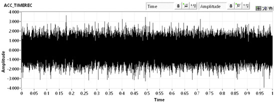 An example of a vibro-diagnostics signal in the time domain obtained for one minute of a running machining process is shown in Figure 8. Signals obtained by all measurements were analyzed by the Fast Fourier Transformation (FFT) method. Figure 9 shows the same signal as in Figure 8 but is processed using Fast Fourier Transform (FFT) to observe the measured amplitudes in the frequency domain.