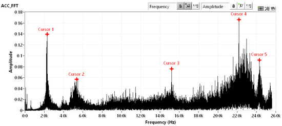 Based on the results, it was specified that, e.g., the peak highlighted in Figure 9 as the “Cursor 3” corresponds to the cutting tool, since the first natural frequency of the cutting tool identified by numerical analysis is close to 15,000 Hz (i.e., it was precisely 14,946 Hz for the presented numerical model consisting of the cutting insert and the tool holder, the back planar surface of which was fixed).