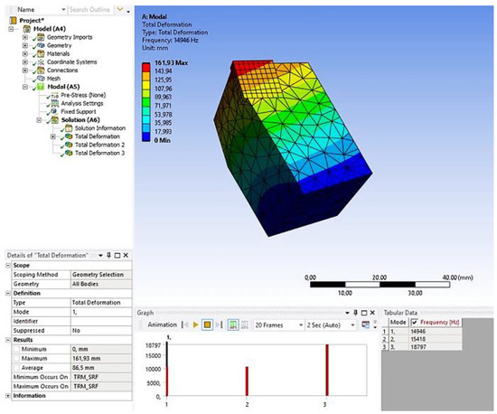 To specify the effect of individual “components” of the machining set on the frequency characteristics and their rigidity, a numerical modal analysis of individual components of the set was performed using the software Ansys 2022 R2. Figure 10 shows a modal analysis of a cutting tool with VBartif = 0.05 mm. (Note: The numerical analysis is not the goal of the presented research, so the authors do not go into detail with the boundary conditions).