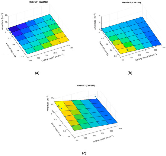 - Based on the measured data, the statistical dependences of the acceleration amplitude (A) as a vibration characteristic on the experimental factors (vc, VBartif) were determined—all at the required level of statistical reliability.