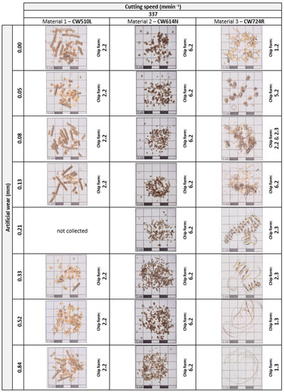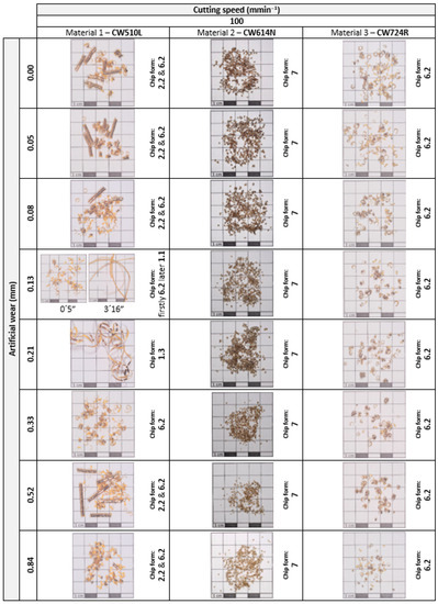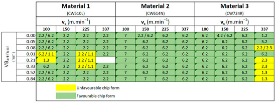 It can be stated that the machined brass alloys have shown relatively good chip formation. The problematic chip form occurred only in some cases of Material 1 (CW510L) and Material 3 (CW724R) that is marked in Figure 14 in yellow with the statement “Unfavourable chip form”.