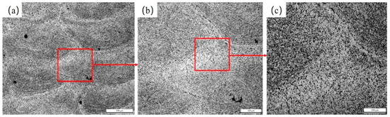 The grains distributed at the boundary of repair are fine equiaxed grains, and the appearance of fine equiaxed grains at this position is not only related to the large temperature gradient but also to the accumulation of Al3(Sc,Zr) particles, which can play a role in grain refinement [9,16]. From the areas indicated in Figure 5b,c, it can be seen that the grain in the fusion zone is columnar and grows vertically along the boundary of the molten pool. This phenomenon is more obvious at the bottom of the repaired groove because the bottom part of the groove was deposited first. At this time, the temperature of the base metal is low, and the direction of the temperature gradient is obvious. From Figure 5d, it can be seen that the orientally-growing columnar crystals at the top of each sedimentary layer transform into equiaxed crystals. This is because the top of the sedimentary layer not only dissipates heat between layers but also dissipates heat through the substrate [17]. The grains in the base material (matrix) region are distributed in coarse bands.