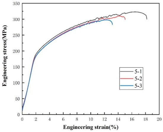 Table 3 shows the mechanical properties of deposition samples of Sc-modified Al-Zn-Mg prealloy powder as formed by DED, and Figure 4 shows the engineering stress–strain curve. It can be seen from the table that the average tensile strength of the alloy is 311.6 MPa, the average elongation rate is 15.6%, and the overall mechanical properties are excellent.